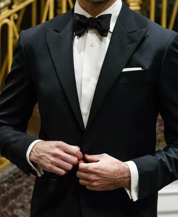 Black suits, white shirts, bow ties