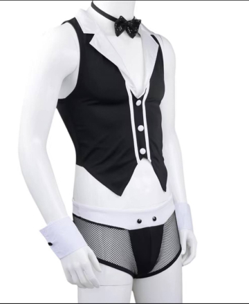Men: black boxers/tank tops, black bow tie; women: in thongs and crop tops!